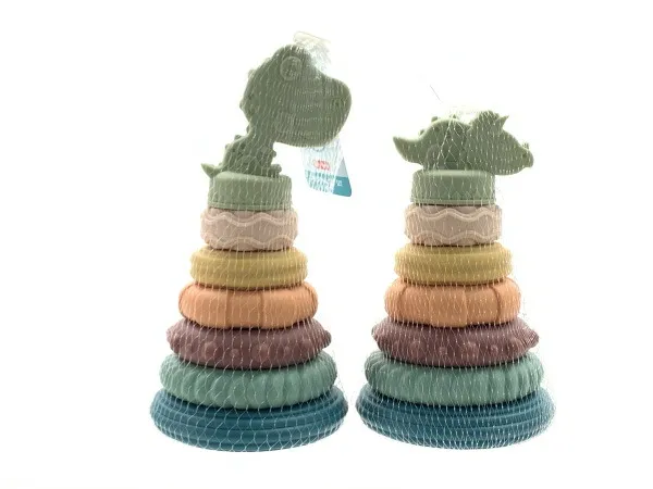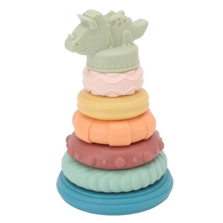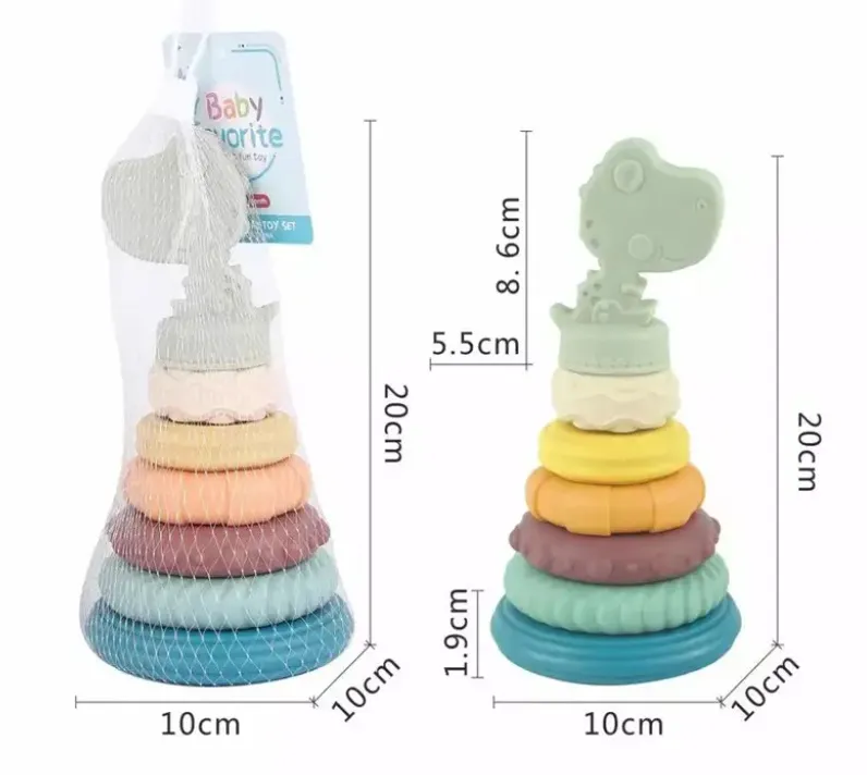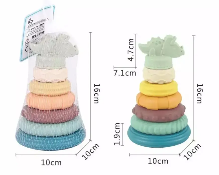 Apilable hecho de silicona de grado alimenticio, libre de BPA, no tóxico e inodoro, seguro y duradero, con bordes lisos que no lastimaran las manos de su bebé, puede sentirse libre de dejar que sus hijos jueguen y muerdan. Tiene 6 círculos de diferentes tamaños y colores, cada uno con una textura diferente y rematado con un juguete en forma de dinosaurio para llamar la atención de su bebé. Los anillos de apilamiento no son sólo para juegos de apilamiento, sino que también se pueden utilizar como un mordedor para aliviar las molestias de la dentición.