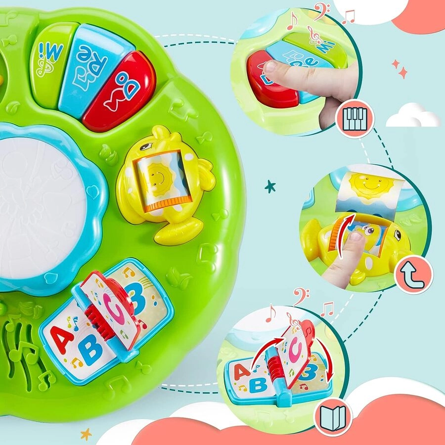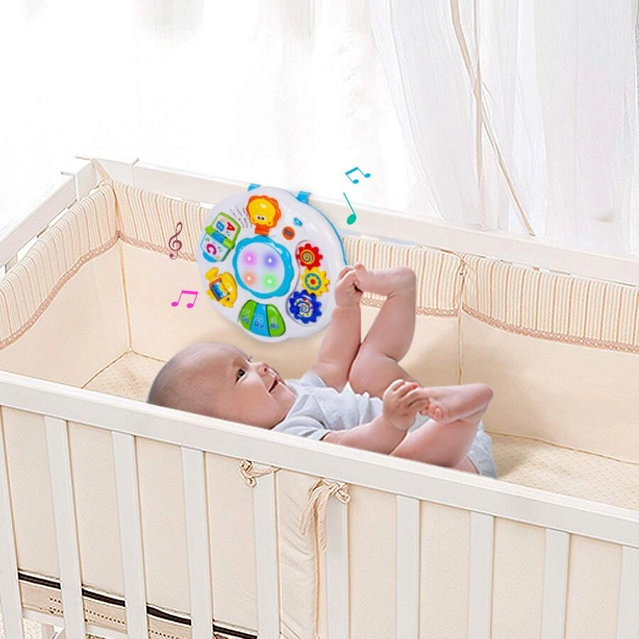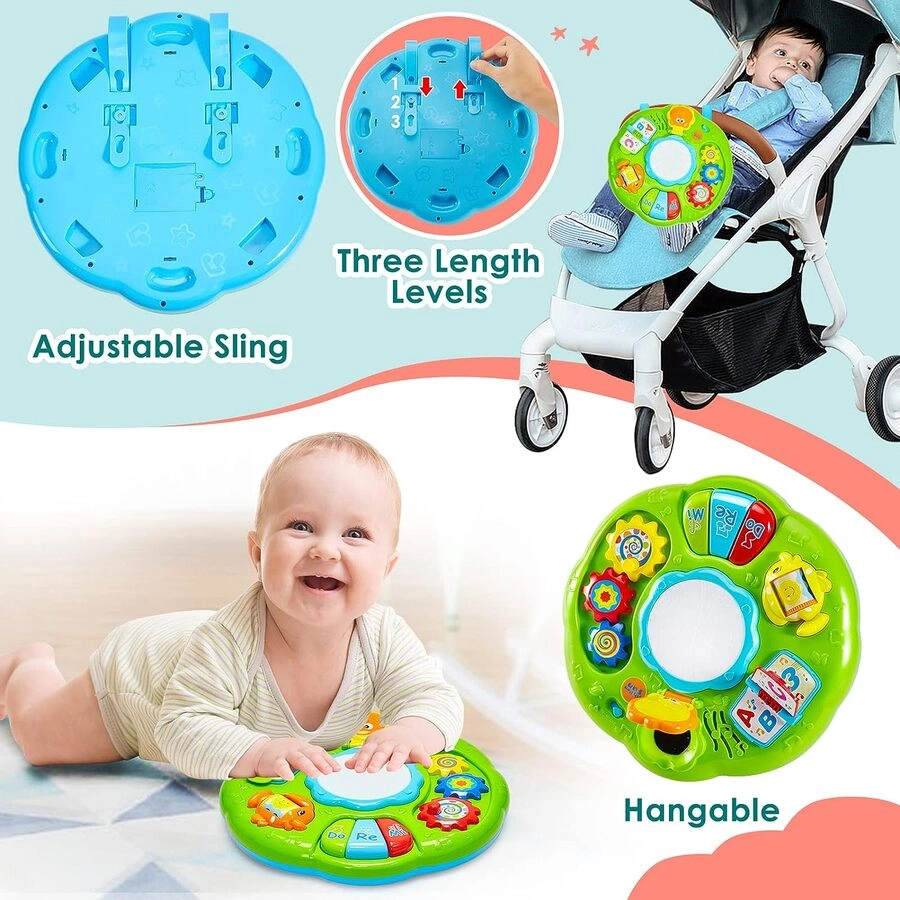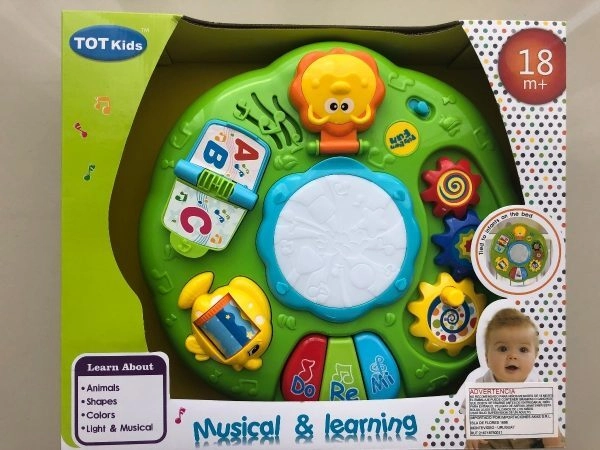 Con este didactico musical, el bebé podrá explorar sonidos, canciones e instrumentos como el piano y el tambor. Fomenta el aprendizaje y es educativo: tiene un engranajes tricolores, libro alfanumérico, espejo de león, mini piano, rueda giratoria y tambor. El bebé podrá aprender números, letras, formas, patrones, colores, sonidos y luces. Es un buen juguete educativo para el bebé. Se puede poner en cualquier lugar plano o atado en la cesta del bebé o cama de bebé para que los niños jueguen. Se puede ajustar el volumen. Se necesitan 3 pilas AA (no incluidas) cuando se utiliza la mesa de aprendizaje de música. Tamaño y material: 12.2 x 12.2 x 7.3 pulgadas. Esta mesa musical está hecha de plástico ABS seguro y no tóxico.