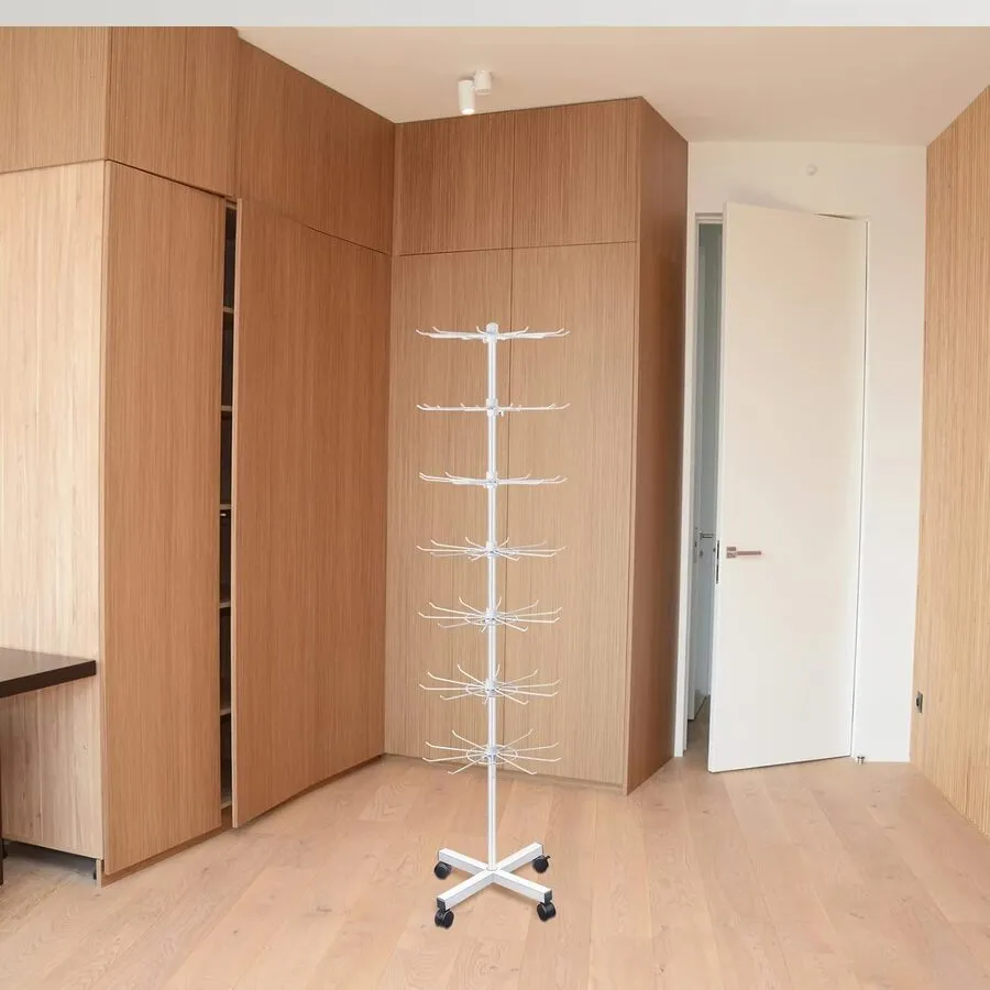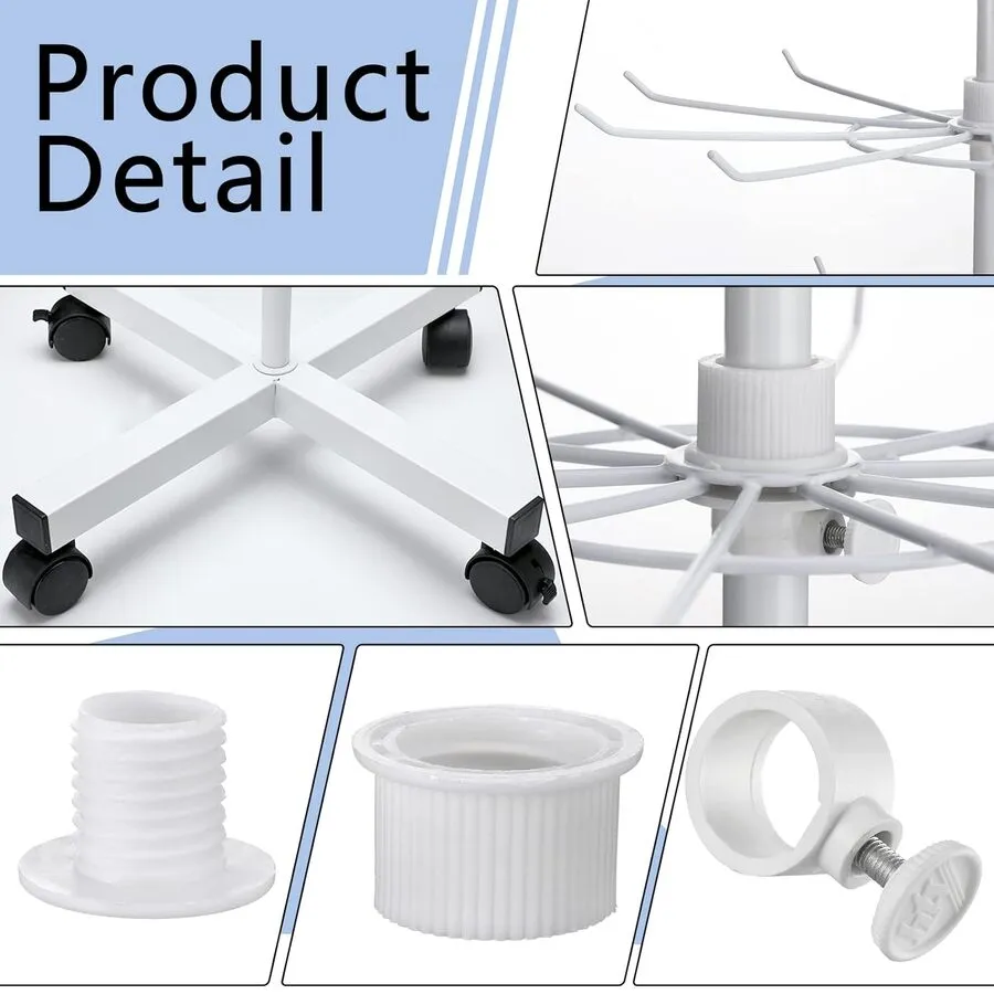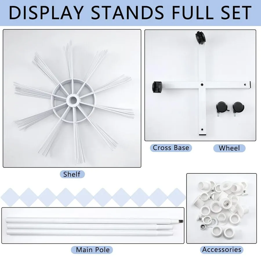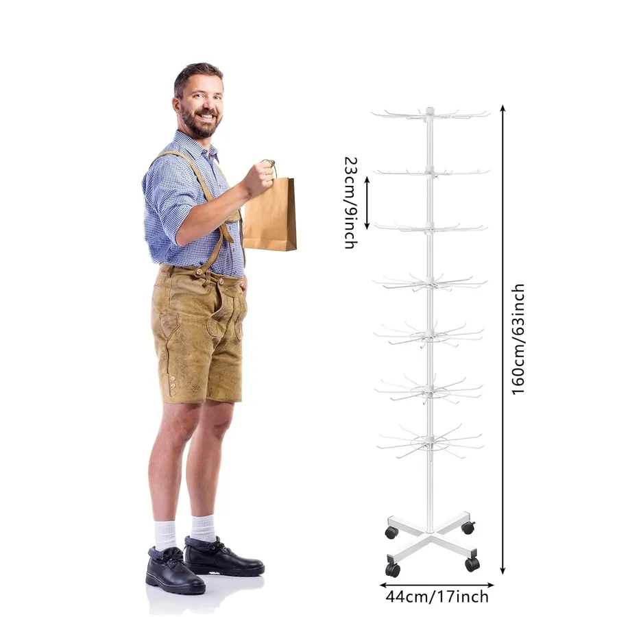 Este soporte de exhibición tiene 10 ganchos en cada nivel, y cada nivel se puede girar de forma independiente 360 grados, asegurando que puedas mostrar la mercancía con la máxima seguridad; y hay 4 ruedas en la parte inferior, para que puedas mover los soportes fácilmente y desmontar para aumentar la estabilidad, lo que te ofrece mucha comodidad.
