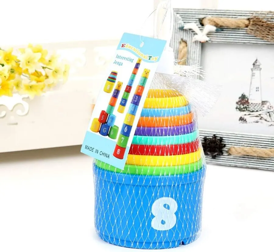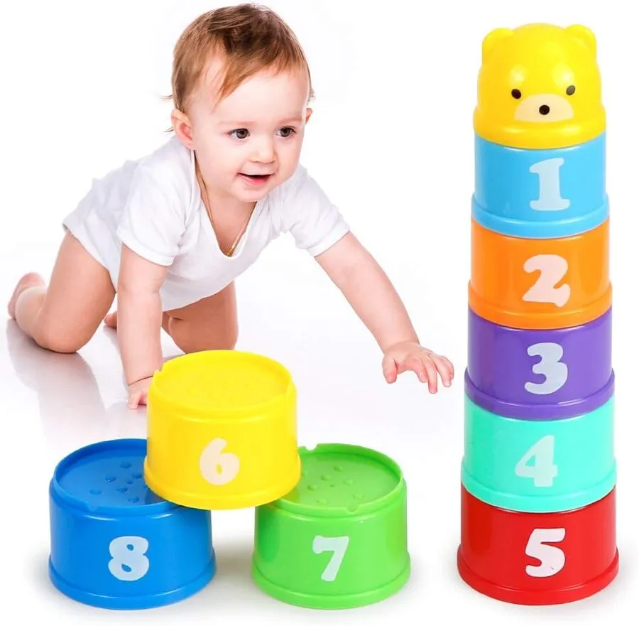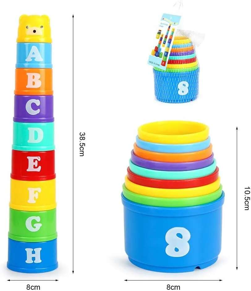Colorida taza apilable: incluye 9 piezas de diferentes colores, tamaños en el cuerpo de las tazas. Puede ayudar a los niños a aprender a identificarlos. Y también puede mejorar la imaginación de los niños y tocar, apilar, plegar, comenzar a construir habilidades de reconocimiento de letras y números, etc. Alta calidad: hecho de plástico de alta calidad, exclusivo y duradero, larga vida útil. Seguro para tus hijos. Más formas de jugar: la taza apilable puede jugar en el baño, los niños también pueden jugar en la playa, piscina, piscina de arena, parque, jardín o cualquier otro lugar siempre que desees. El tamaño del almacenamiento es de 7 x 7 x 10,5 cm. Altura total de la pila 38 cm. Edad sugerida: +6 meses