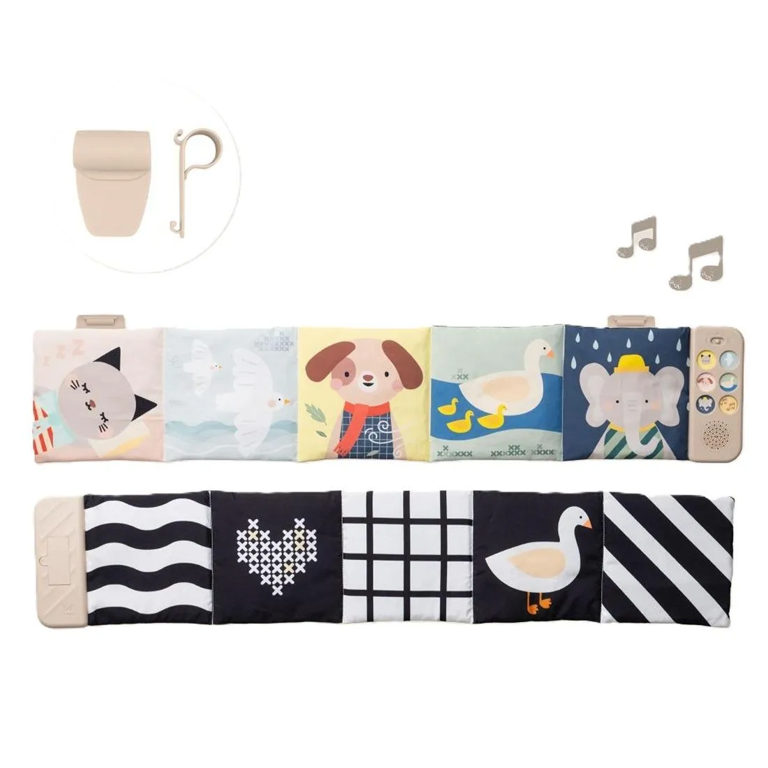 Este libro de actividades con sonidos relajantes para Recién Nacidos es un libro de tela suave y autoportante diseñado para calmar y entretener a los bebés desde el primer día.