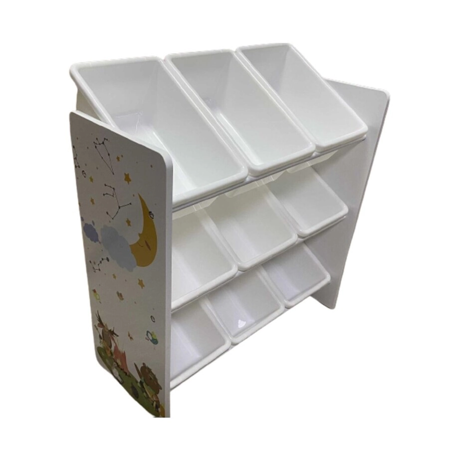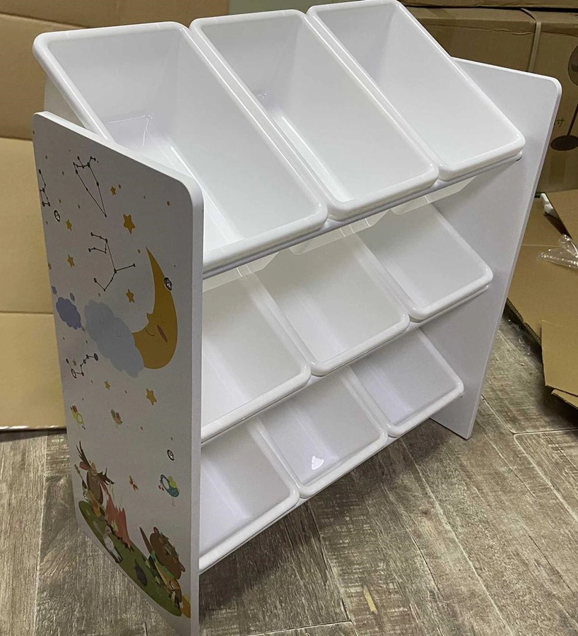 Juego de cajas de almacenamiento para niños para ayudar a organizar los juguetes. Tamaño 65 x26,5 cm. x 60 cm. Una mueble organizador muy práctico para los accesorios del dormitorio infantil. Robusta estructura en madera y tubos metálicos. Las cestas de plástico removibles en ángulo mantienen los juguetes y accesorios muy pequeños y son fáciles de devolver al estante al final de los juegos.